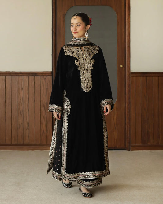 Black Velvet 3 Piece Velvet Unstitched Dress -Noir- Party Wear