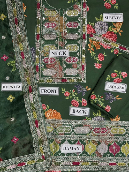 Green Embroidered Chiffon 3 Piece Unstitched Suit AJRNC-D18- Party Wear