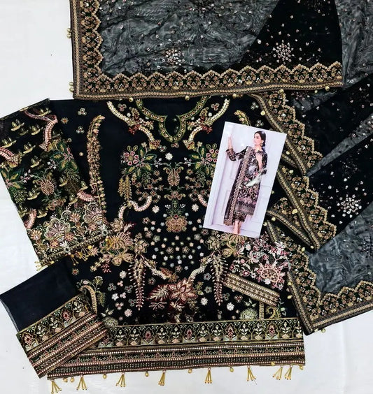 Luxury Net Embroidered 3 piece Unstitched Dress MB -Black - Party Wear