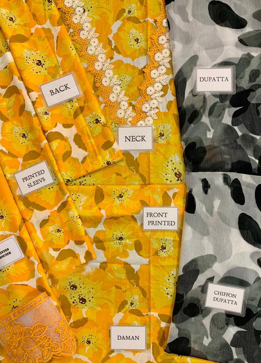 Yellow Luxury Chicken Kari 3 Piece Unstitched Lawn Suit - Summer Collection