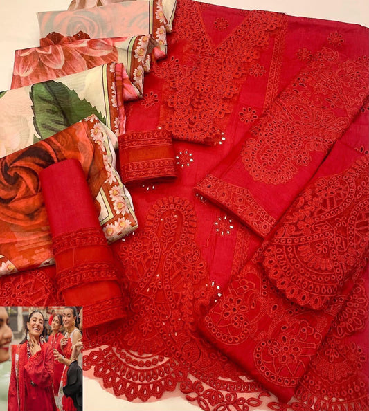 Red Embroidered Chicken Kari Lawn 3 Piece Unstitched Suit ML-D04 - Summer Collection