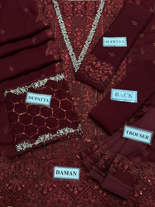 Mehroon Embroidered Chiffon 3 Piece Unstitched Suit -Party Wear