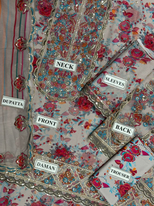Embroidered Multi Floral Luxury Chiffon 3 Piece Unstitched Dress CHZ-Party Wear