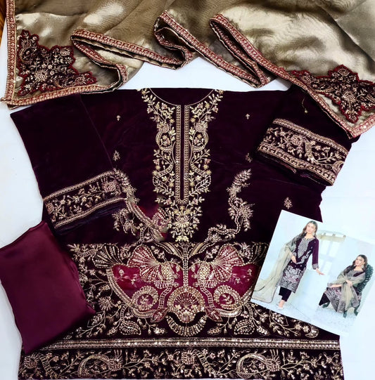 Maroon Luxury Velvet Dress Embroidered 3 Piece Unstitched