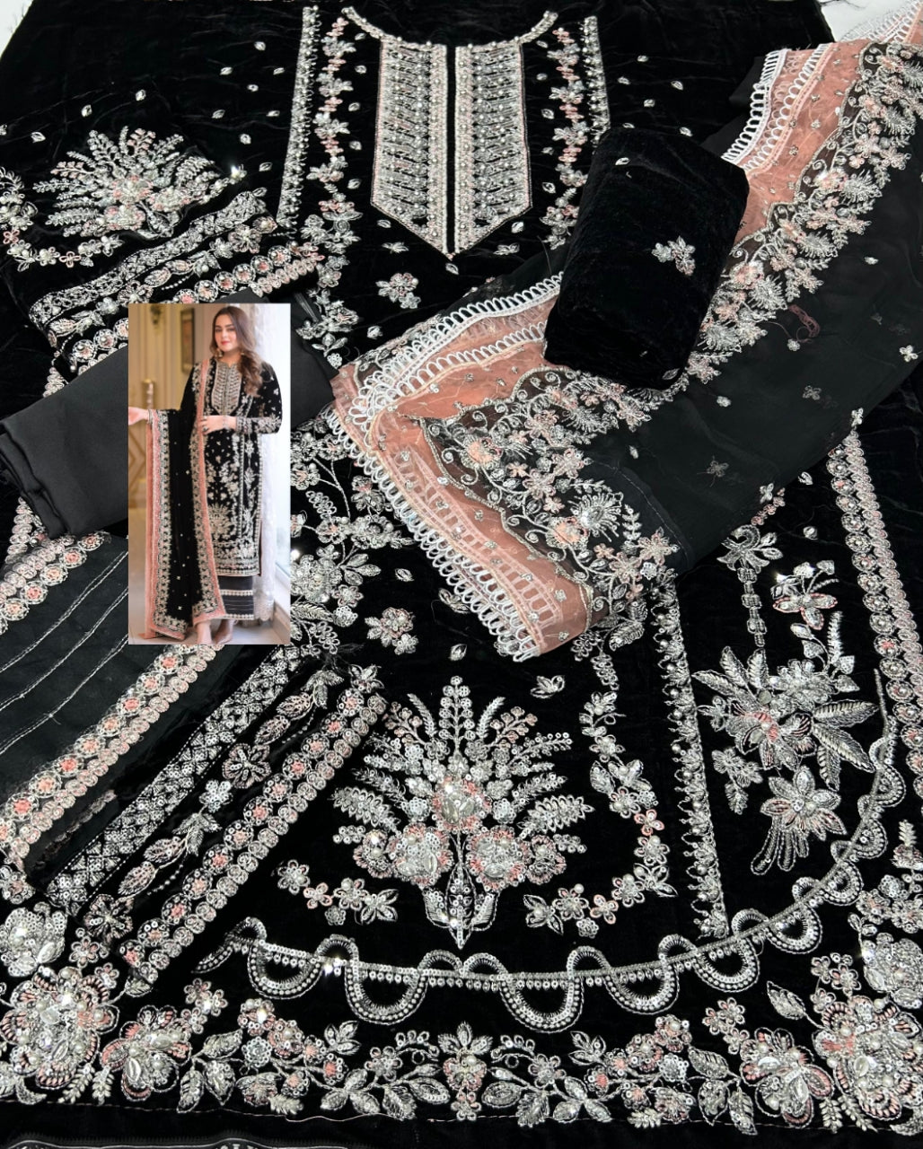 Black Luxury Velvet Suit 3 Piece Unstitched - ANL