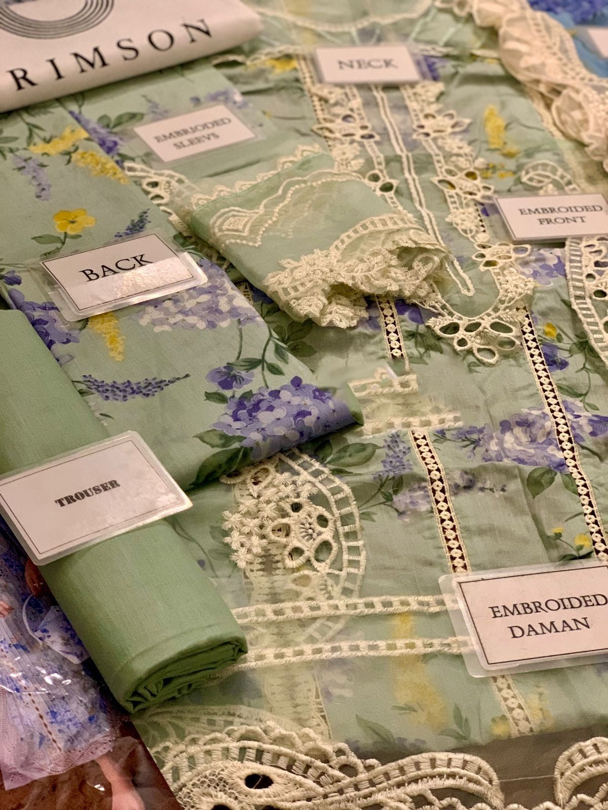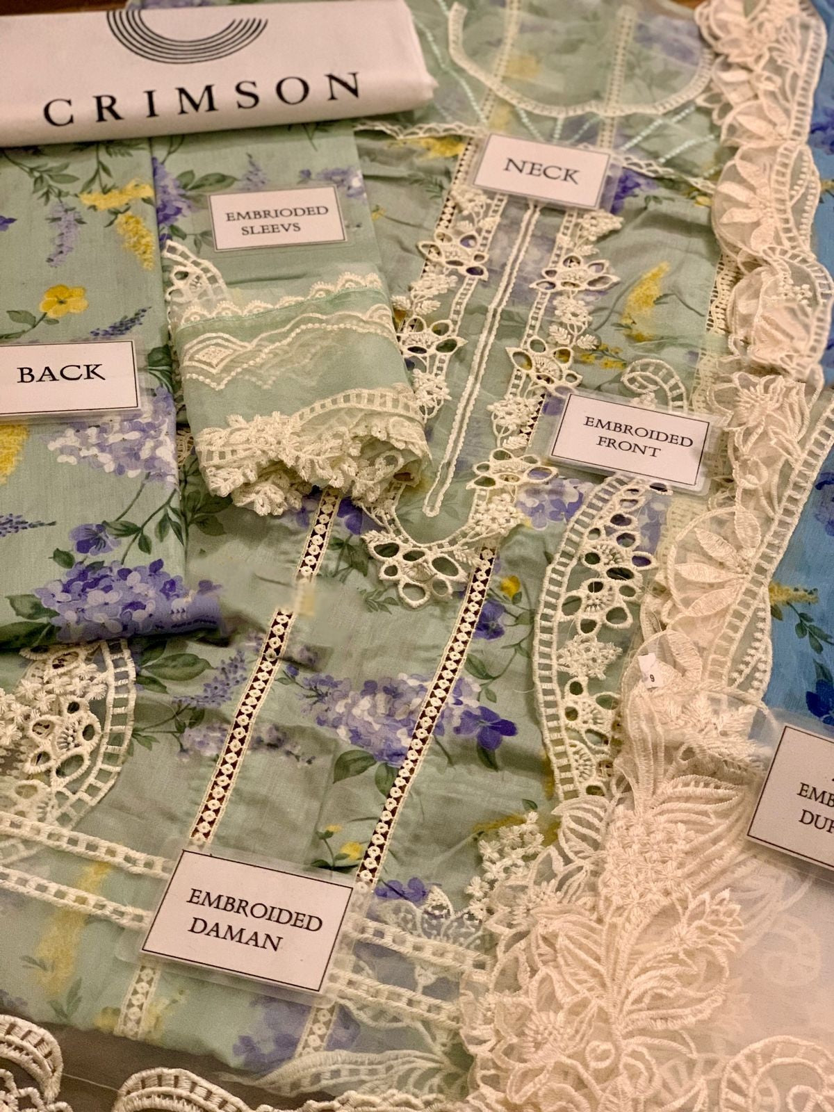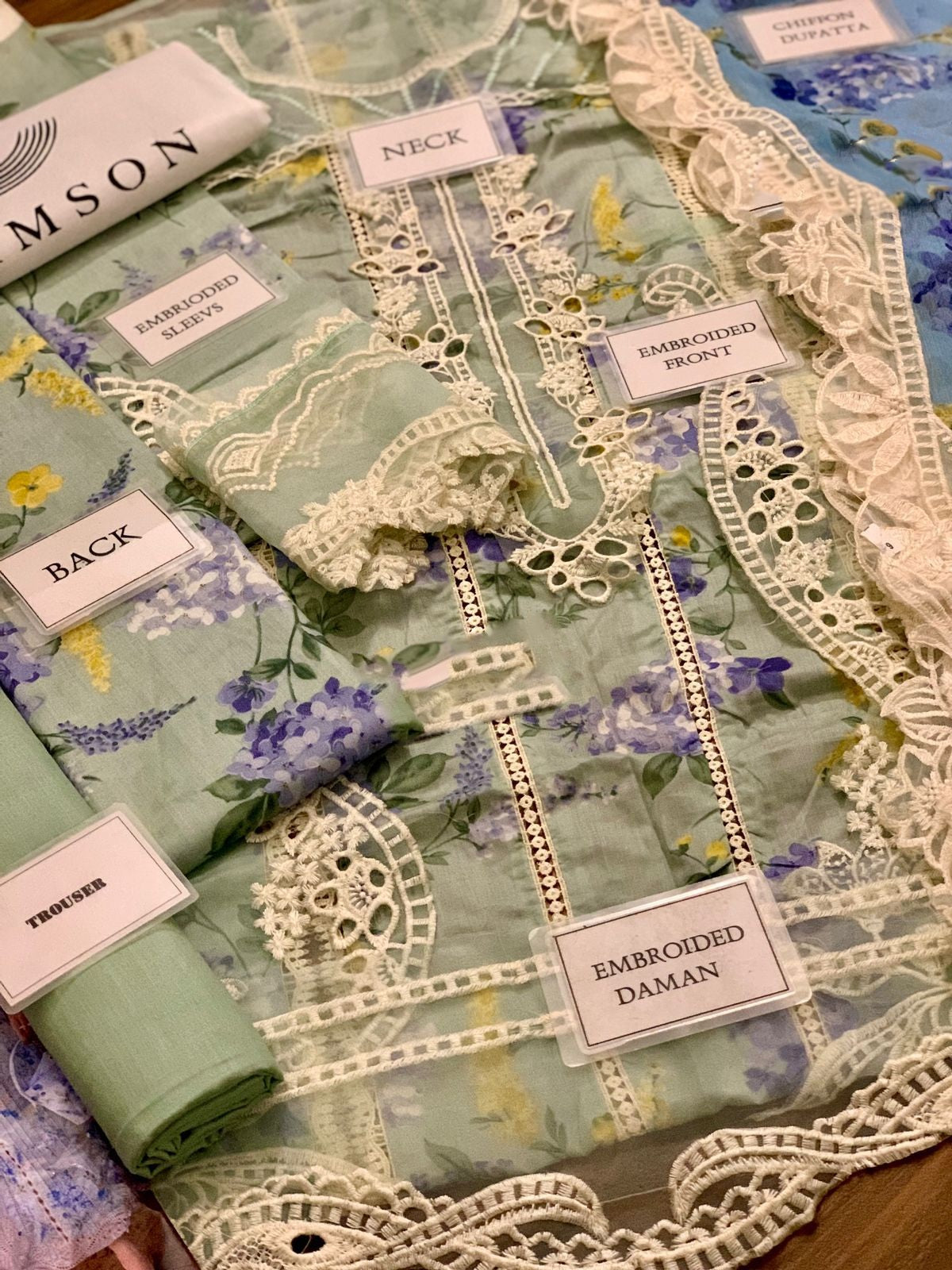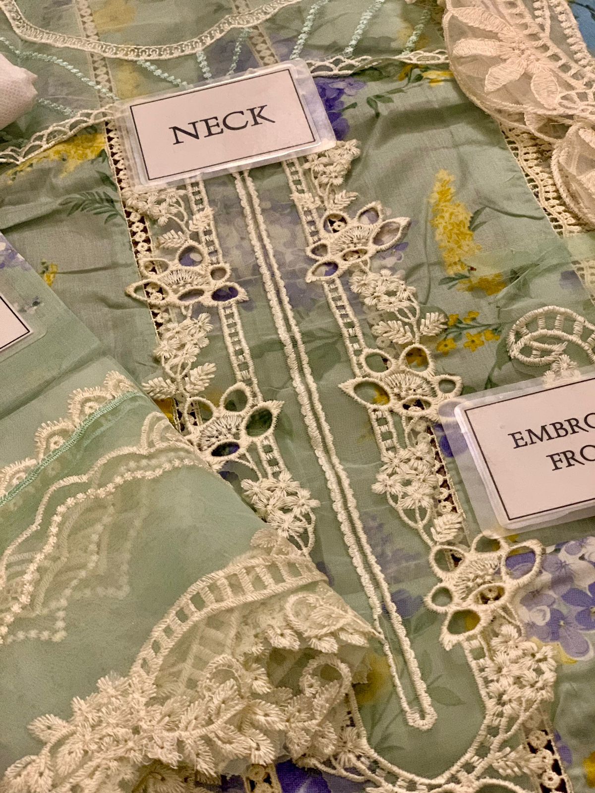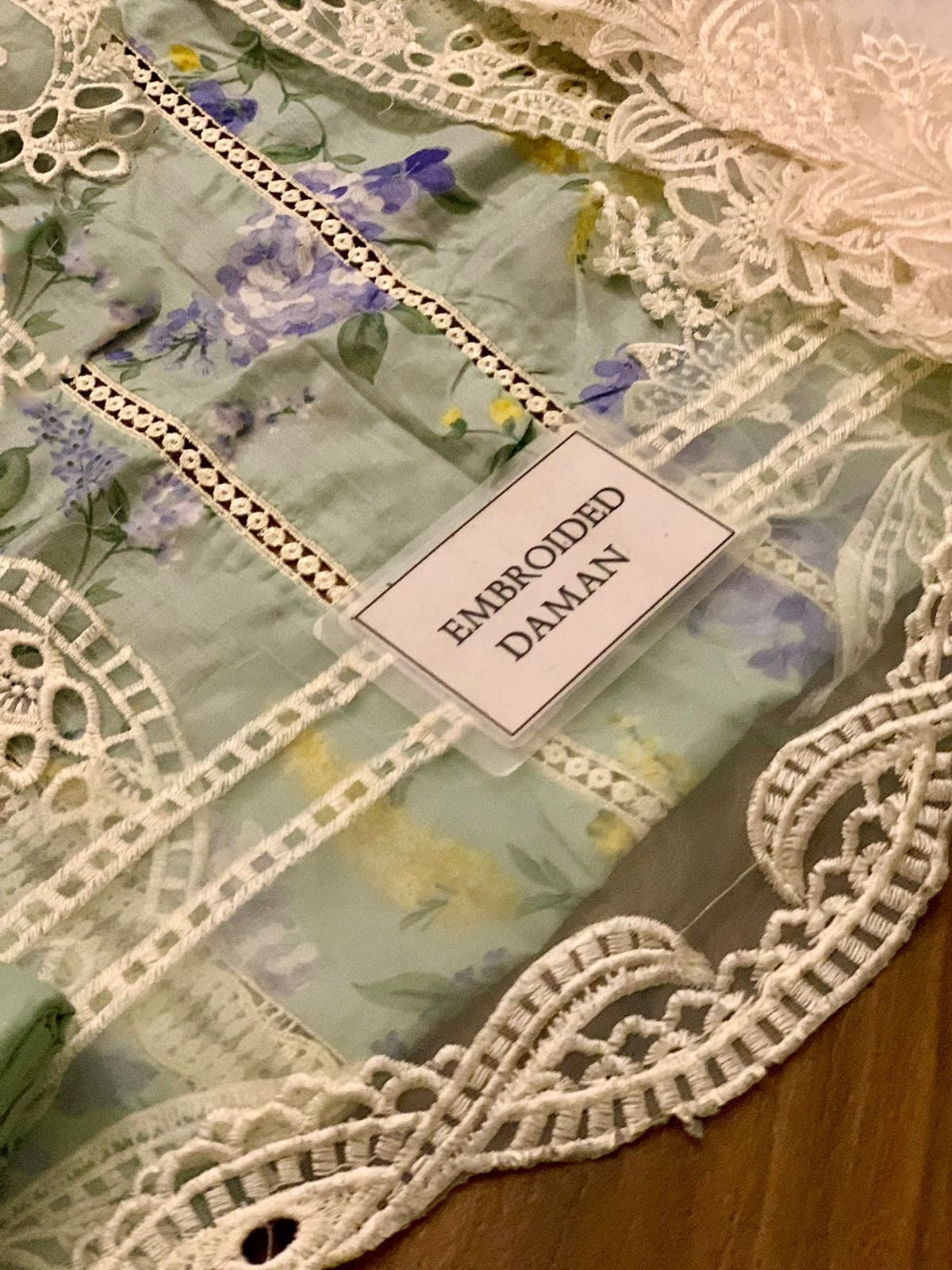 - Printed lawn front with fully heavy embroidered schifflie lace attach with heavy embroidered schifflie neck line with heavy embroidered schifflie chak and daman bunches