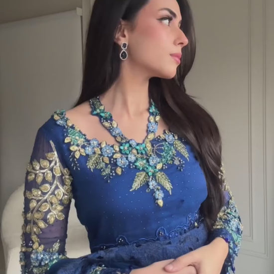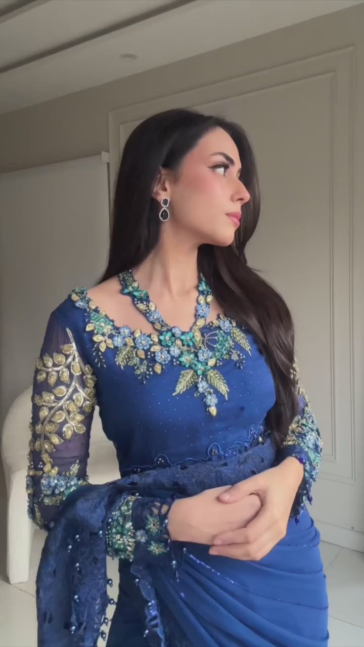 Luxury Blue Chiffon Embroidered Unstitched Saree -Party Wear
