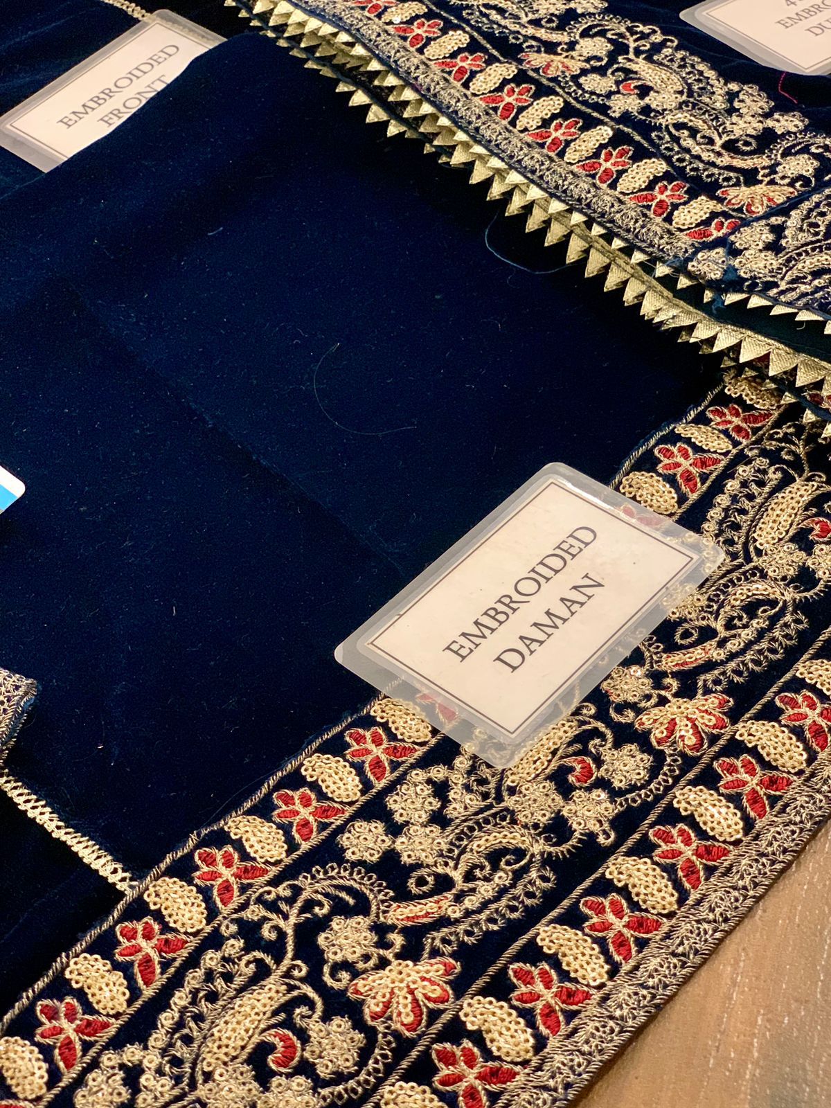 - Velvet fully heavy embroidered spangle work centre panel front with fully embroidered spangle work left & right panel attach with embroidered spangle work daman border