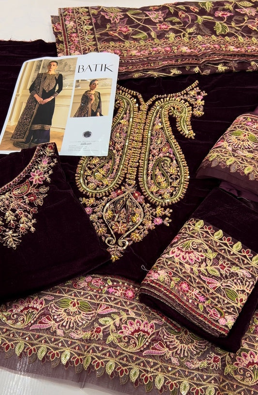 Mehroon Velvet Unstitched Embroidered Dress- Party Wear